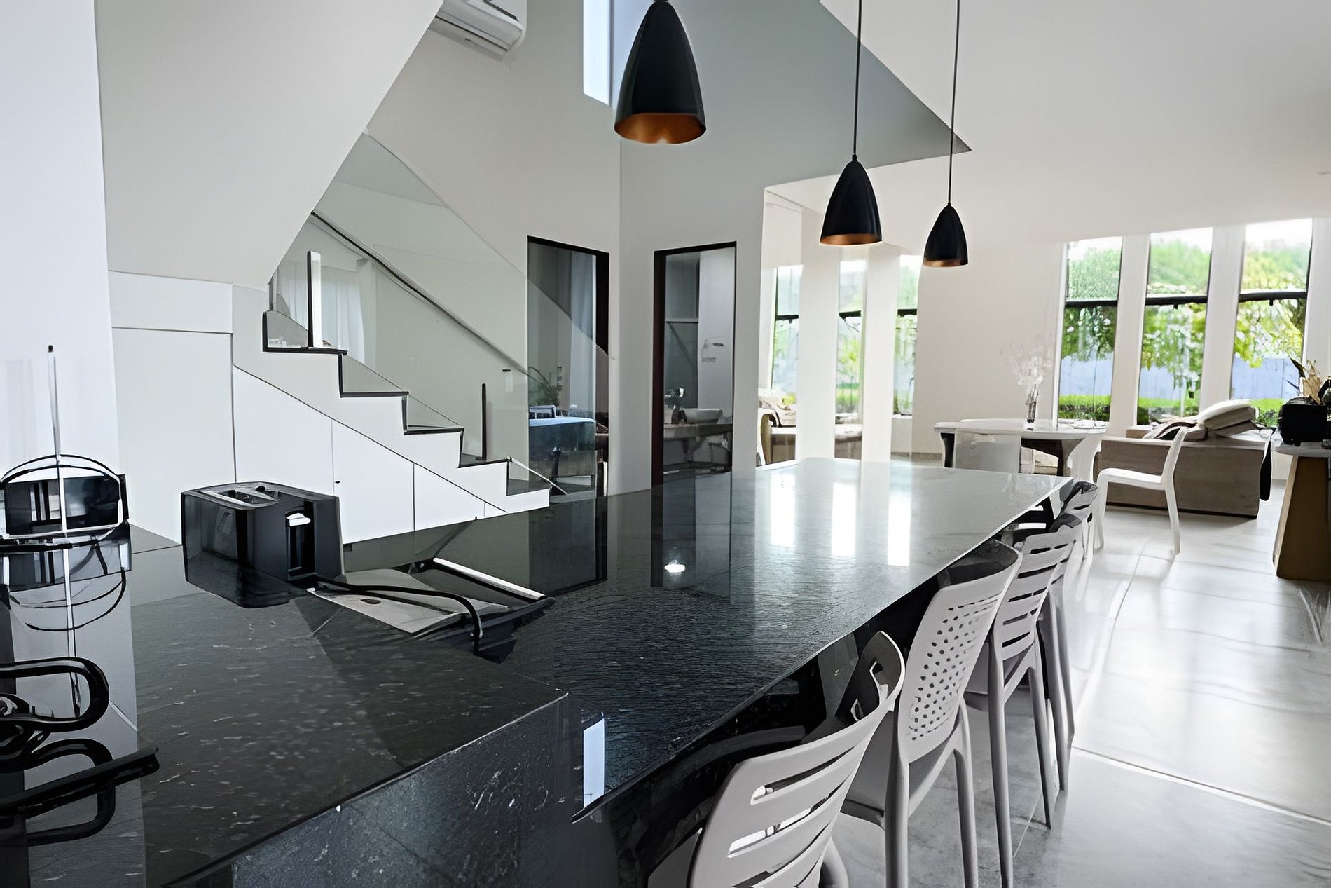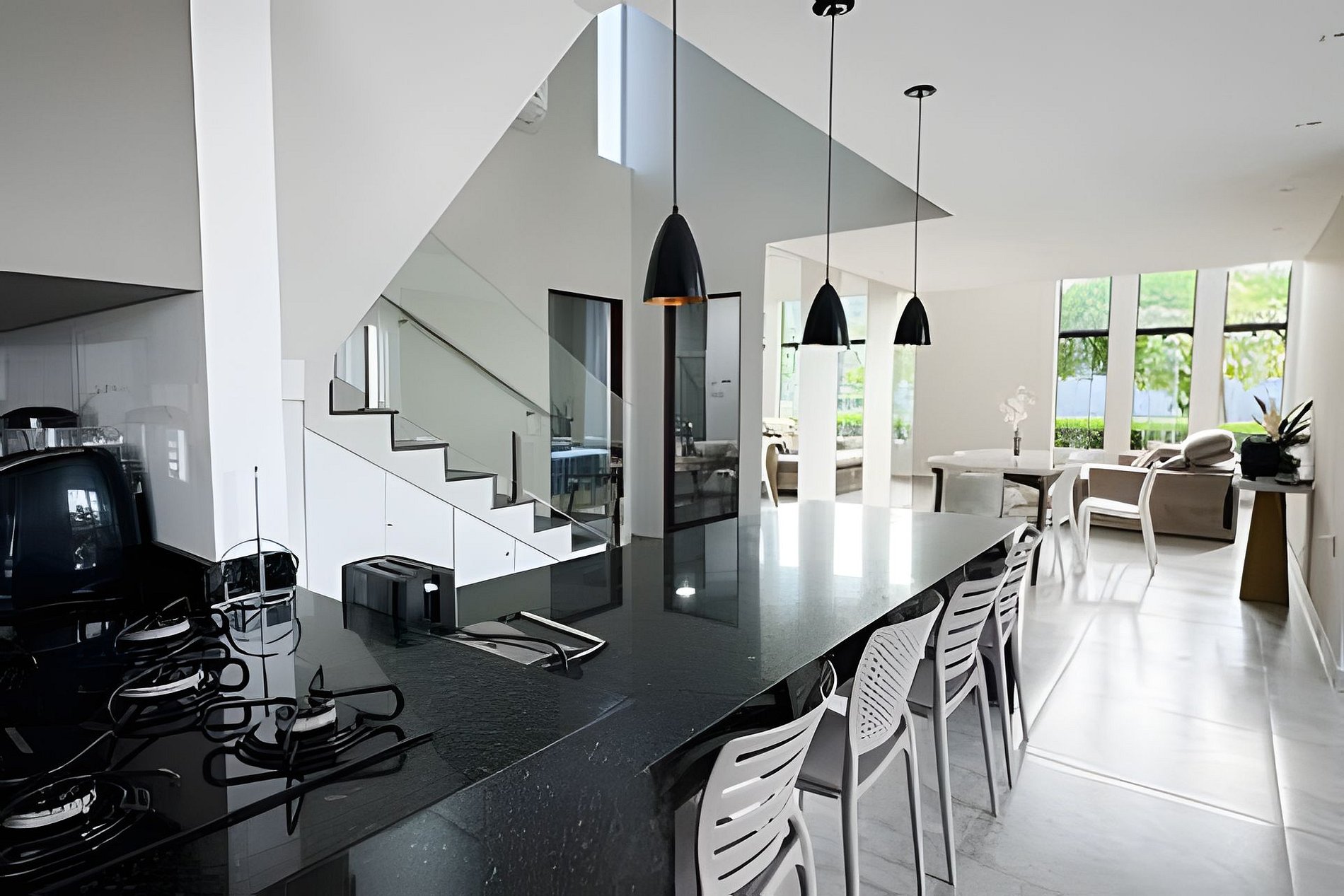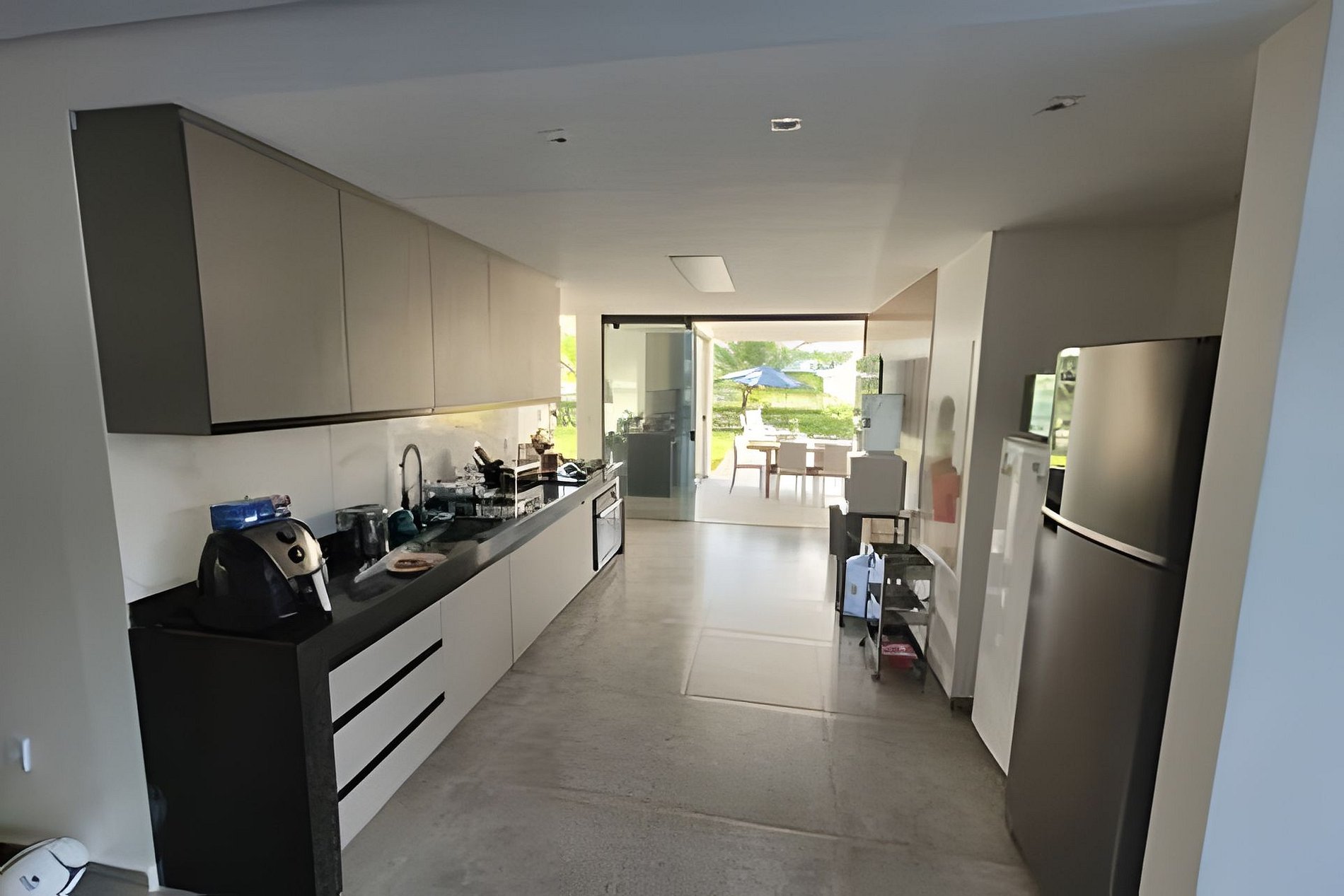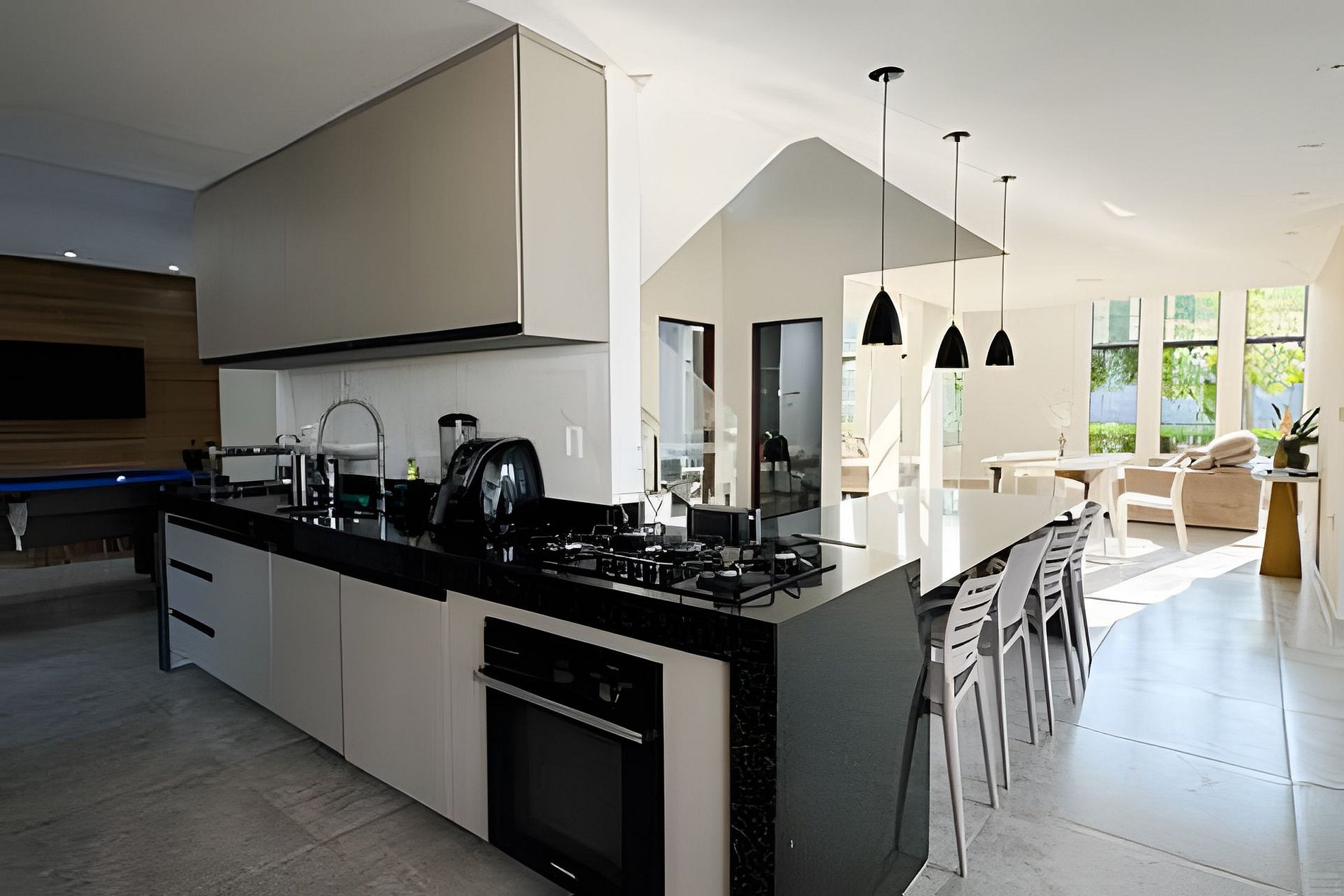 Cozinha espaçosa, com eletrodomésticos como fornos elétricos, microondas, bancada com cooktop, gelágua, misteira, liquidificador, airfryer, batedeira, torradeira, geladeira, freezer e utensílios para cozinhar e servir.