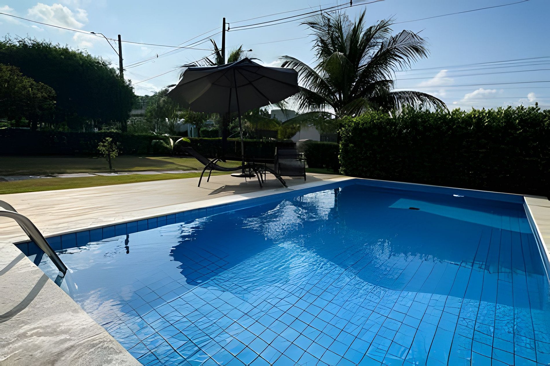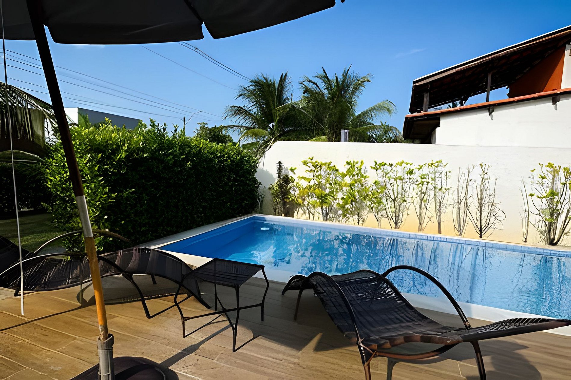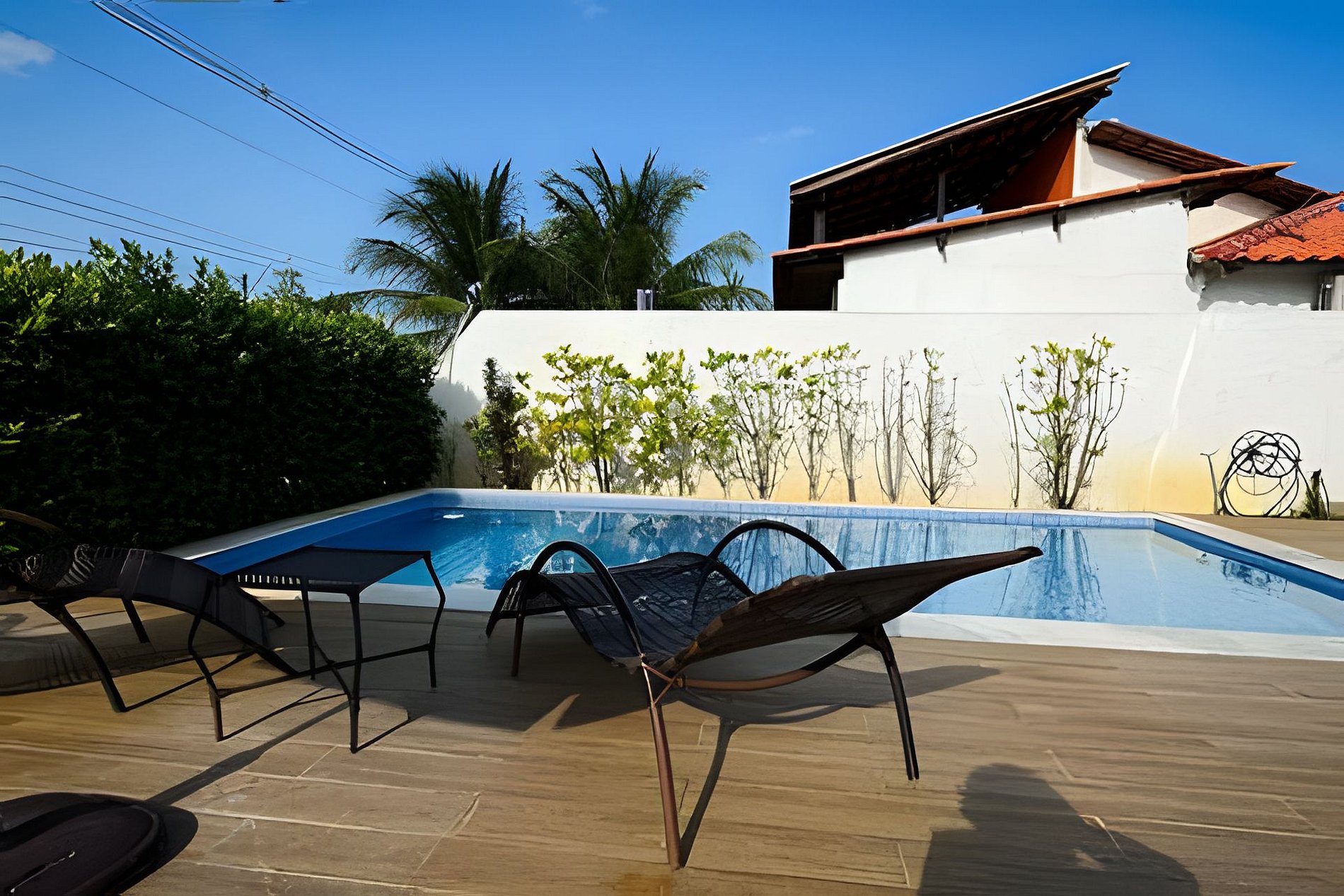 A casa tem piscina e varandas, sendo uma com área de churrasqueira e mesa grande.