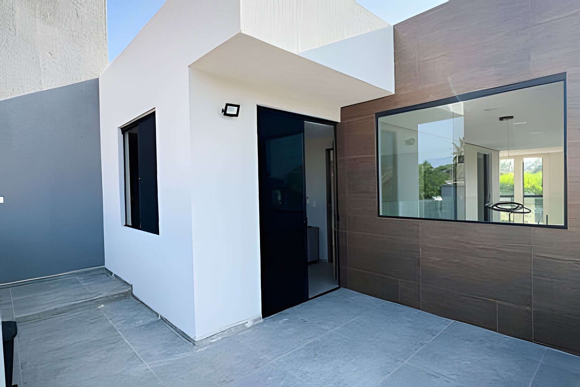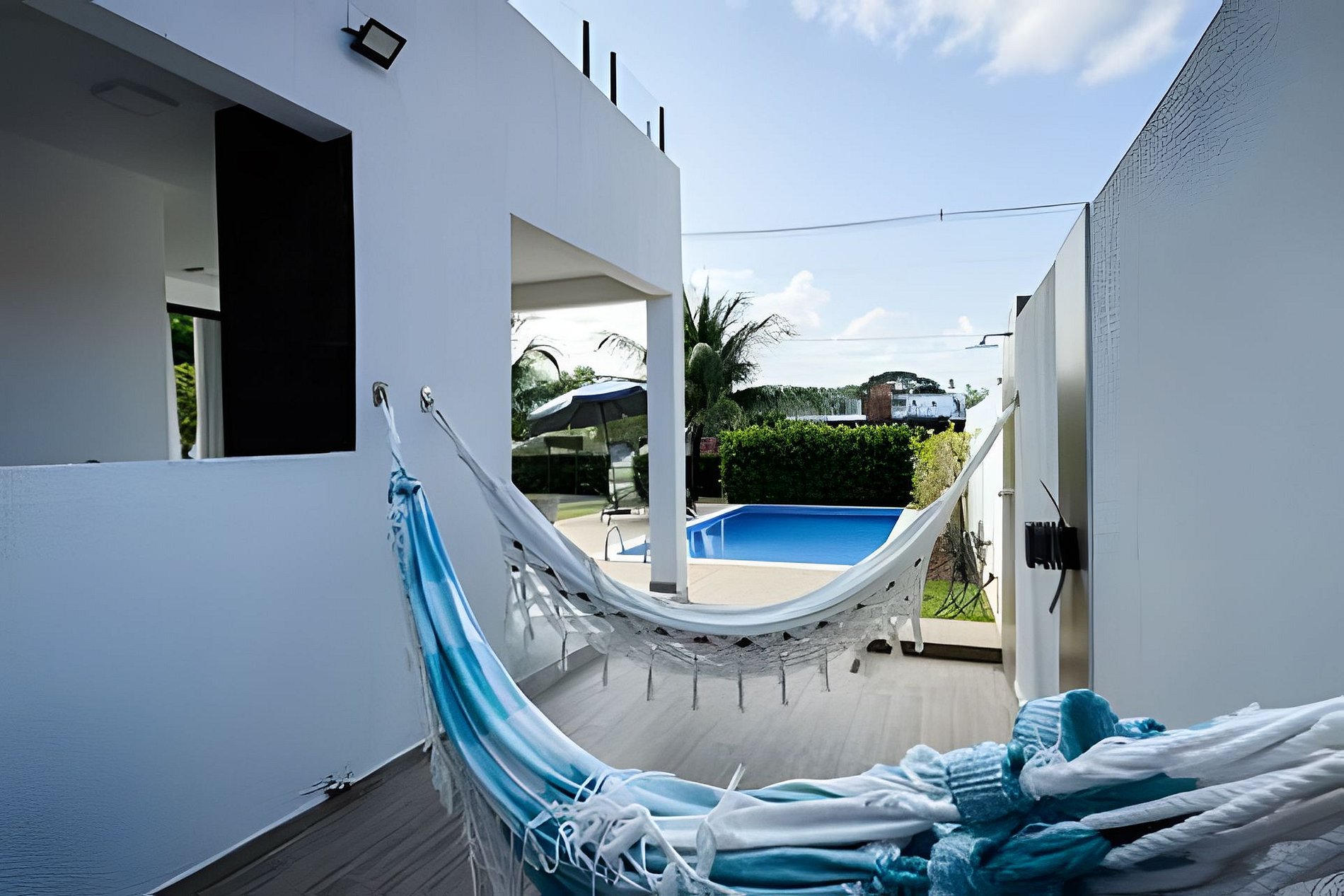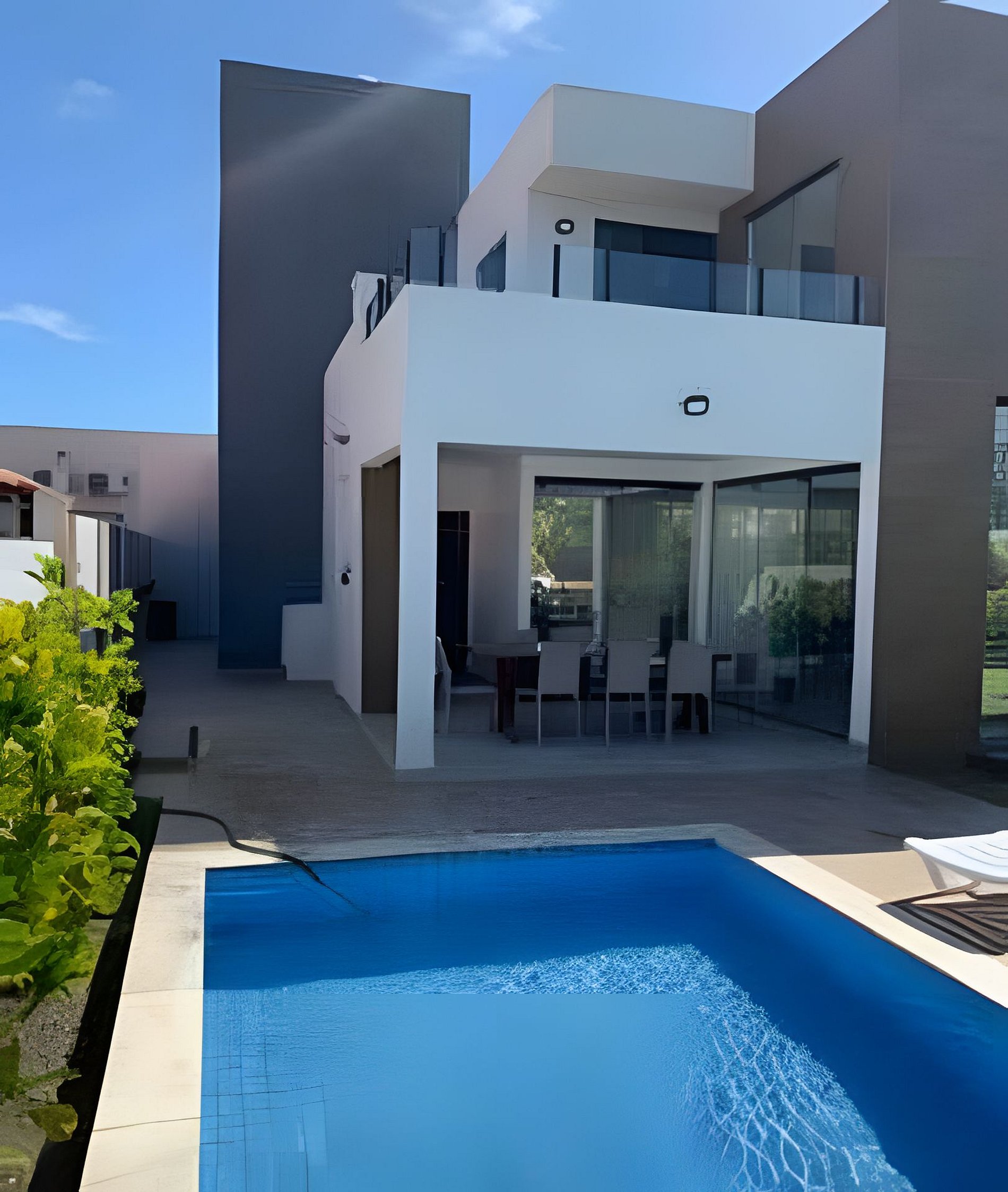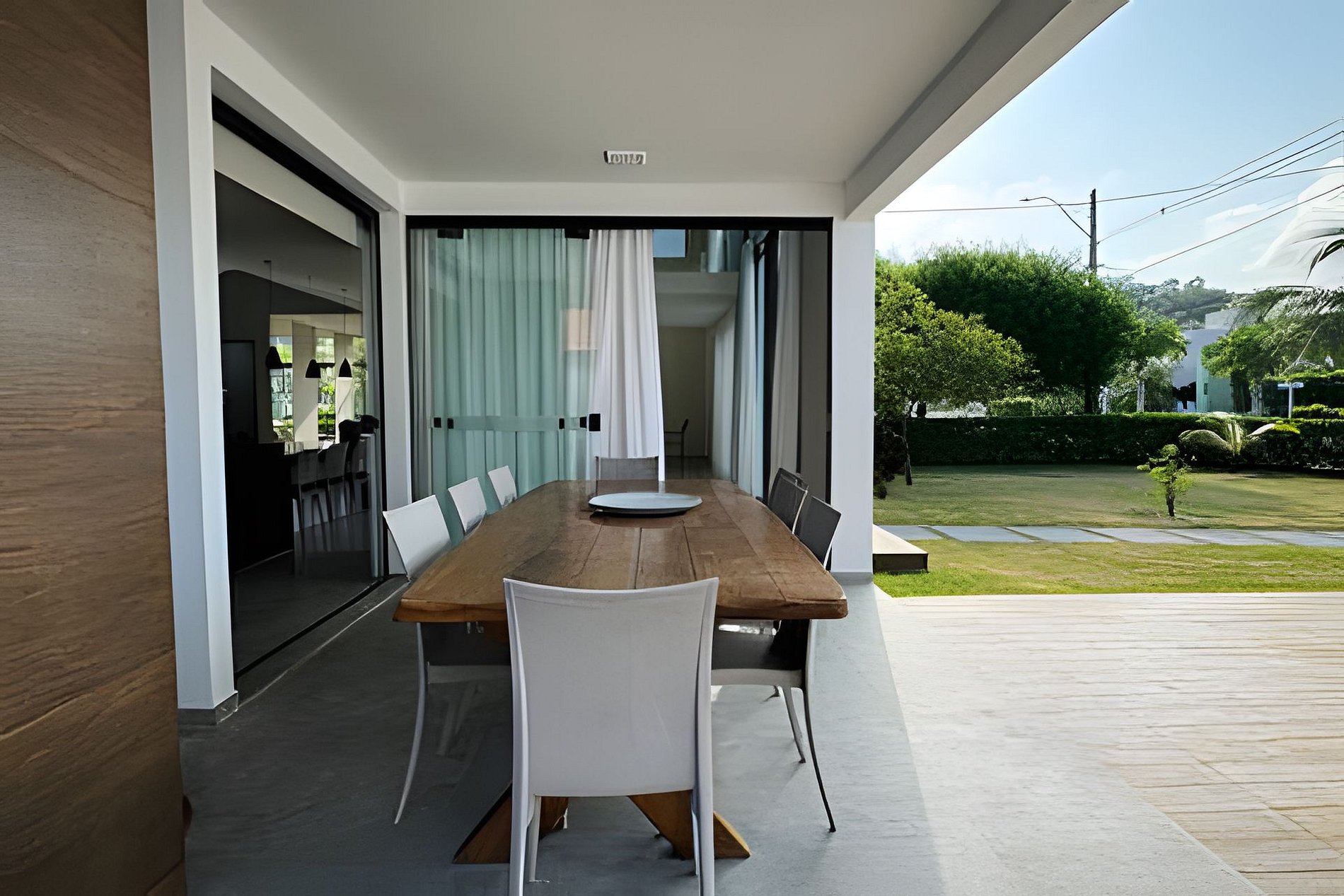 A casa tem piscina e varandas, sendo uma com área de churrasqueira e mesa grande.