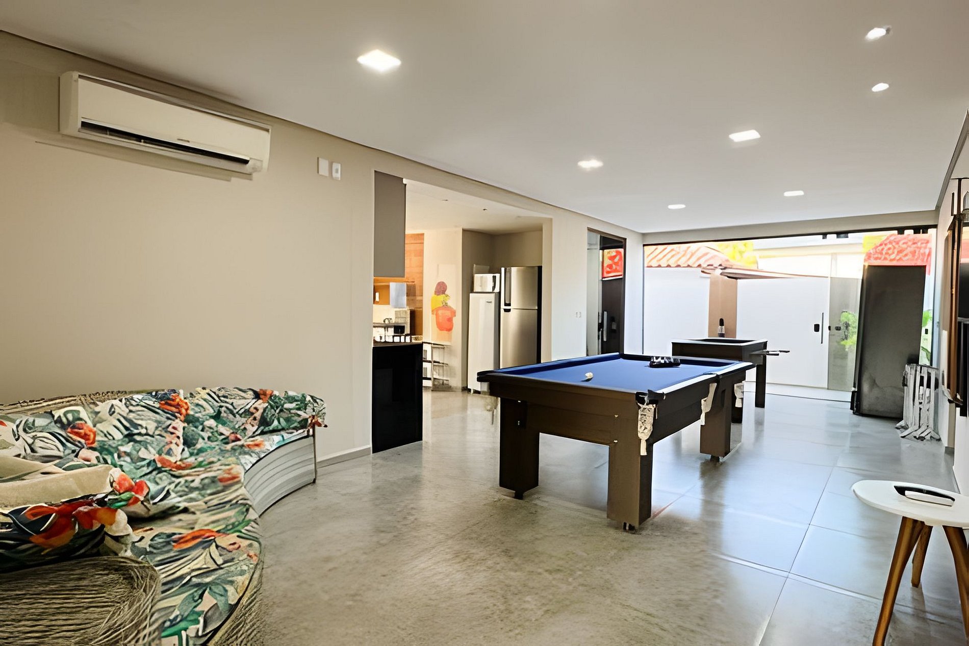 Sala de jogos com sinuca, Pegolin/Totó e mesa de carteado Espaço Gourmet e piscina.