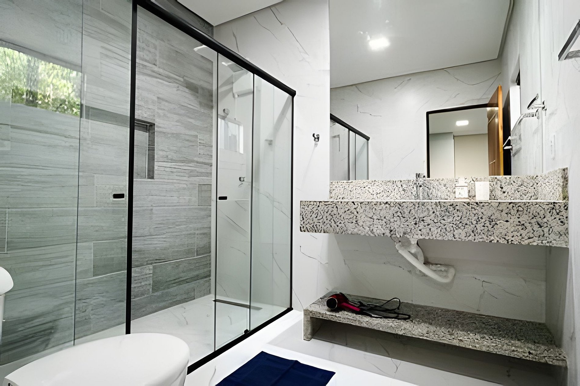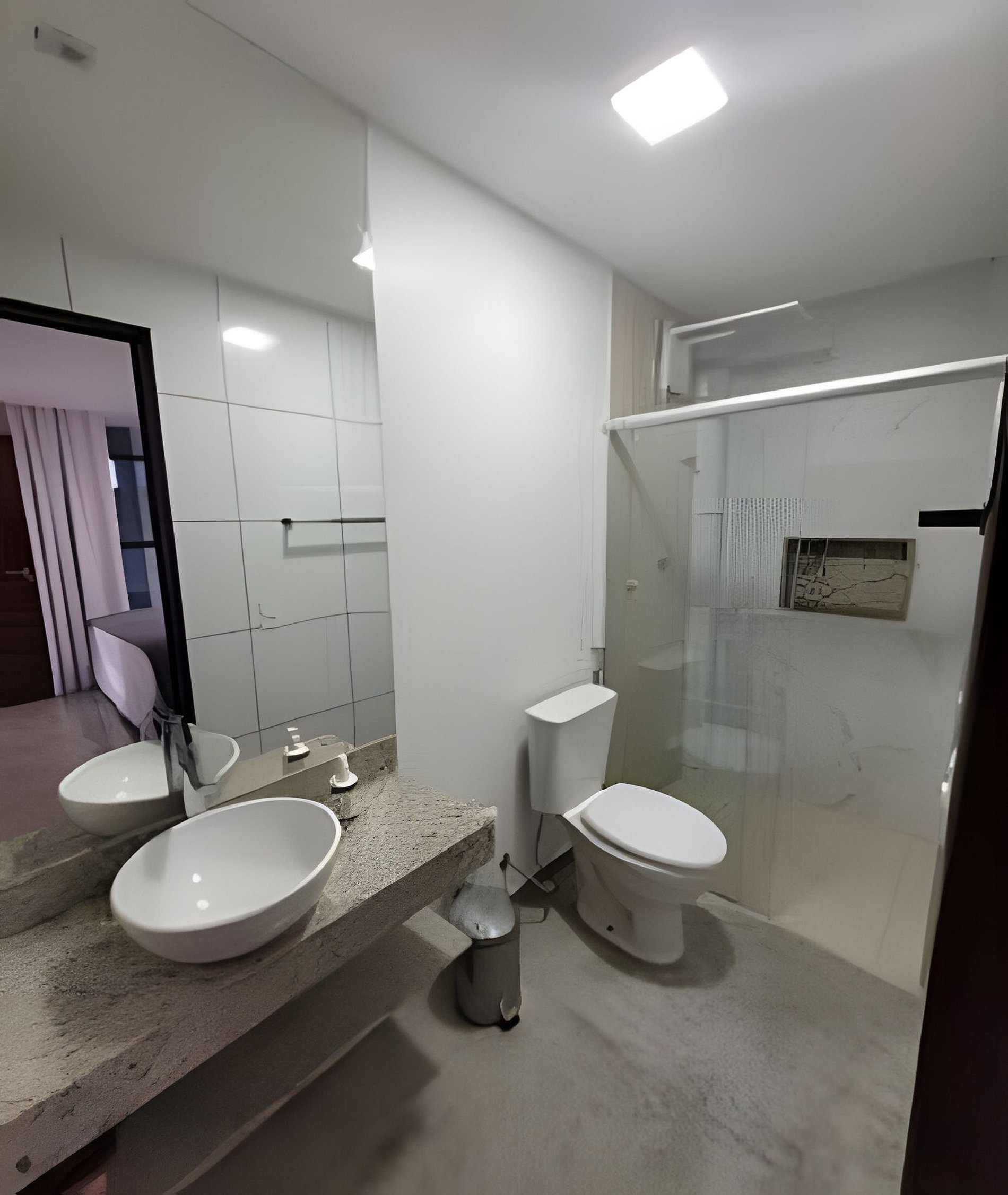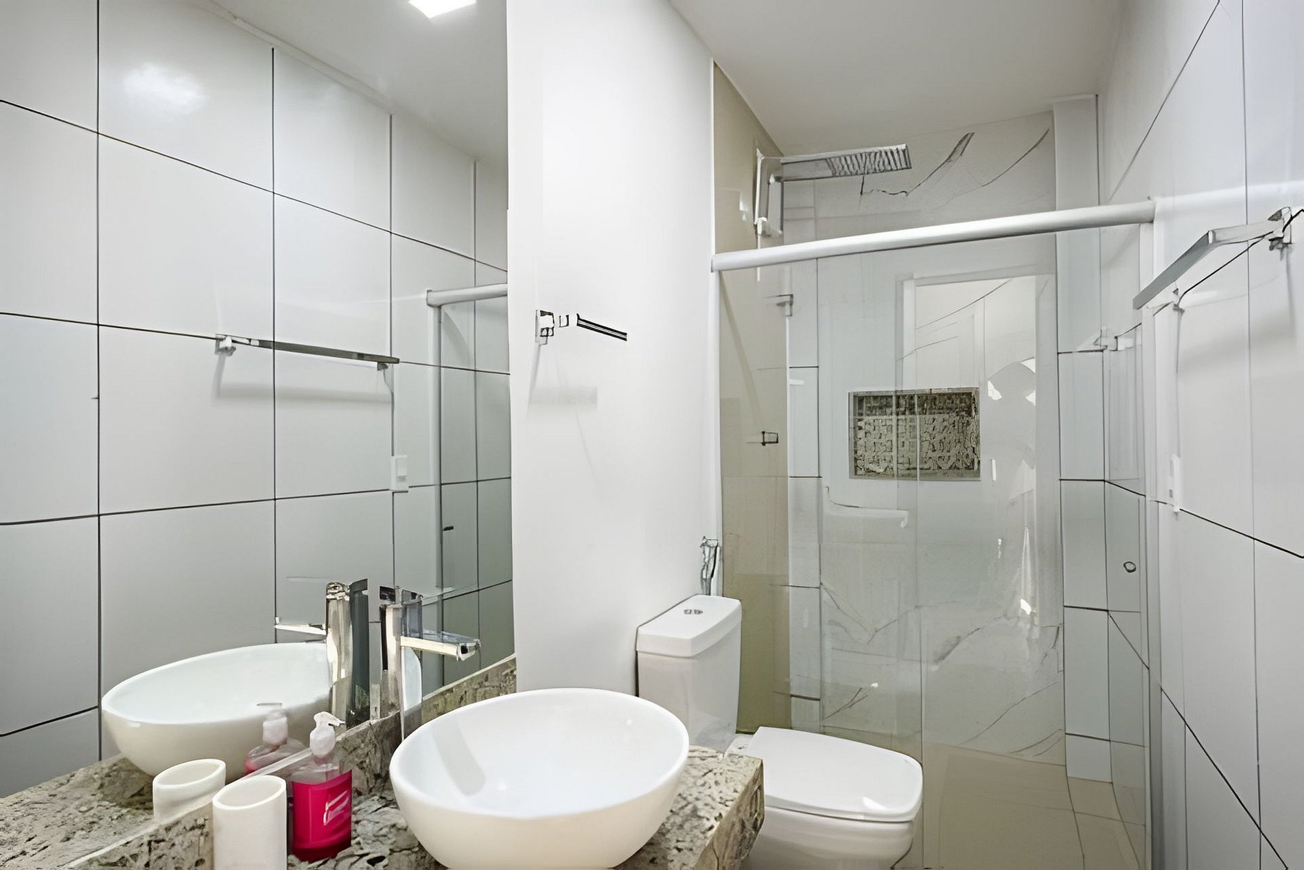 Os banheiros têm box com vidro, vaso com ducha higiênica.